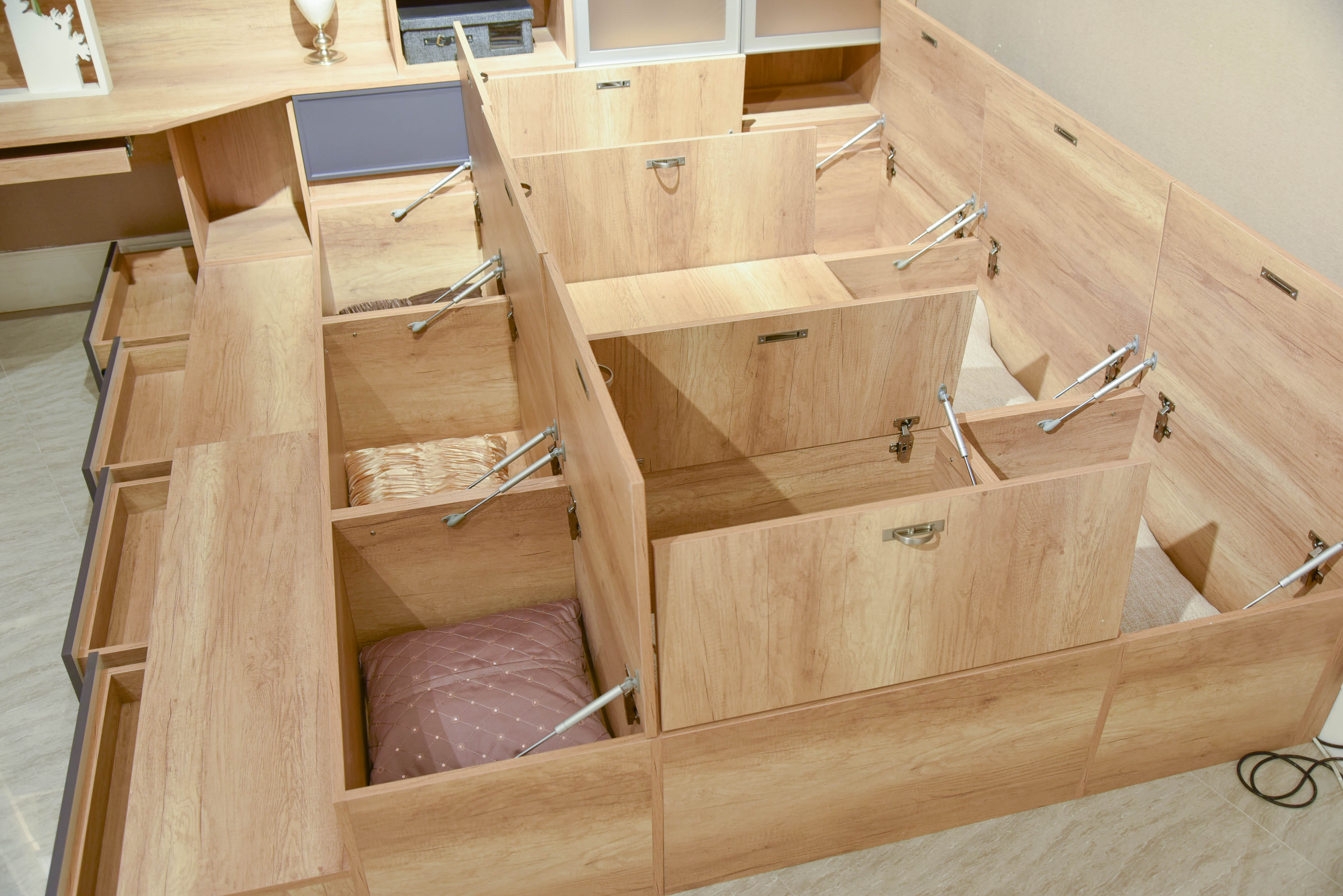 現(xiàn)代年輕人難免有需要居家辦公的時刻,領(lǐng)尚家居榻榻根據(jù)需求打造適合在家辦公、學(xué)習(xí)的功能區(qū)。此外領(lǐng)尚榻榻米還有著"多重身份",它可以是臥室:當(dāng)碰上親戚、客人來借宿,榻榻米瞬間變化成臥室。在榻榻米就能鋪上床單放上枕頭,就能成為一張雙人床,為家里多添一間臥室。它可以是休閑區(qū):領(lǐng)尚家居榻榻米隱藏了個可升降的桌子,需要時將它升起,可化身一張桌子,桌子四周還貼心地留了底部空間,可以把腳放進(jìn)去避免盤腿坐太久腿麻。