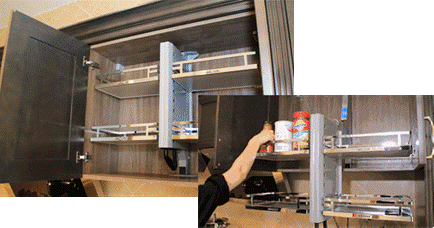 領尚櫥柜在采用吊柜、地柜的基礎上,增加吊柜拉籃設計、地柜推拉車設計,在轉角空間增設轉角拉籃。安裝領尚櫥柜后,不管高低深淺都可隨手取物,增加櫥柜可變性,廚房收納更為合理化,輕松將廚房擴容一倍!