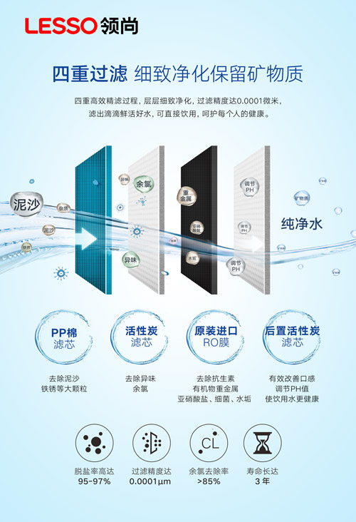 四重高效精濾過程,層層細(xì)致凈化:美國進口RO膜,四重優(yōu)質(zhì)濾芯除雜,過濾精度達0.0001微米