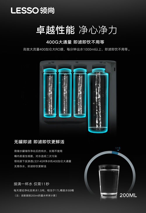 即濾即飲,400G大通量無需等待:接滿一杯水僅需11秒,無儲水罐避免二次污染