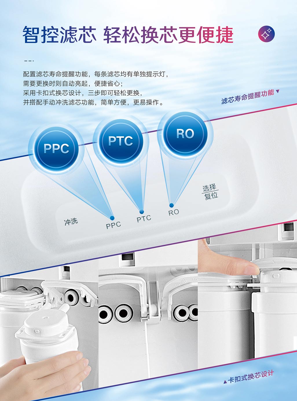 ③智控換芯提醒功能,每條濾芯有單獨提示燈,卡扣式換芯設計