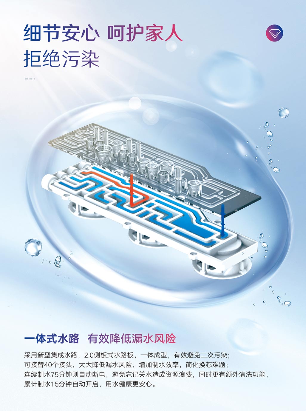 ①一體式水路,2.0側板式水路板,降低漏水風險