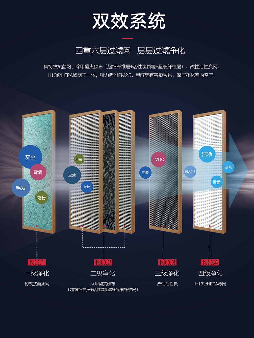 過濾工藝:初效抗菌除濾網(wǎng)+除甲醛夾炭布+改性活性炭+H13級HEPA濾網(wǎng)