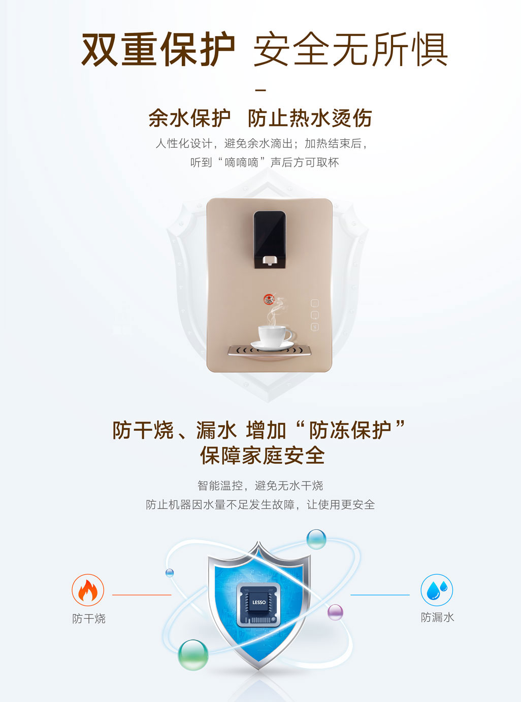 防干燒、漏水、防凍保護、智能溫控,防止機器因水量不足發(fā)生故障,讓使用更安全。