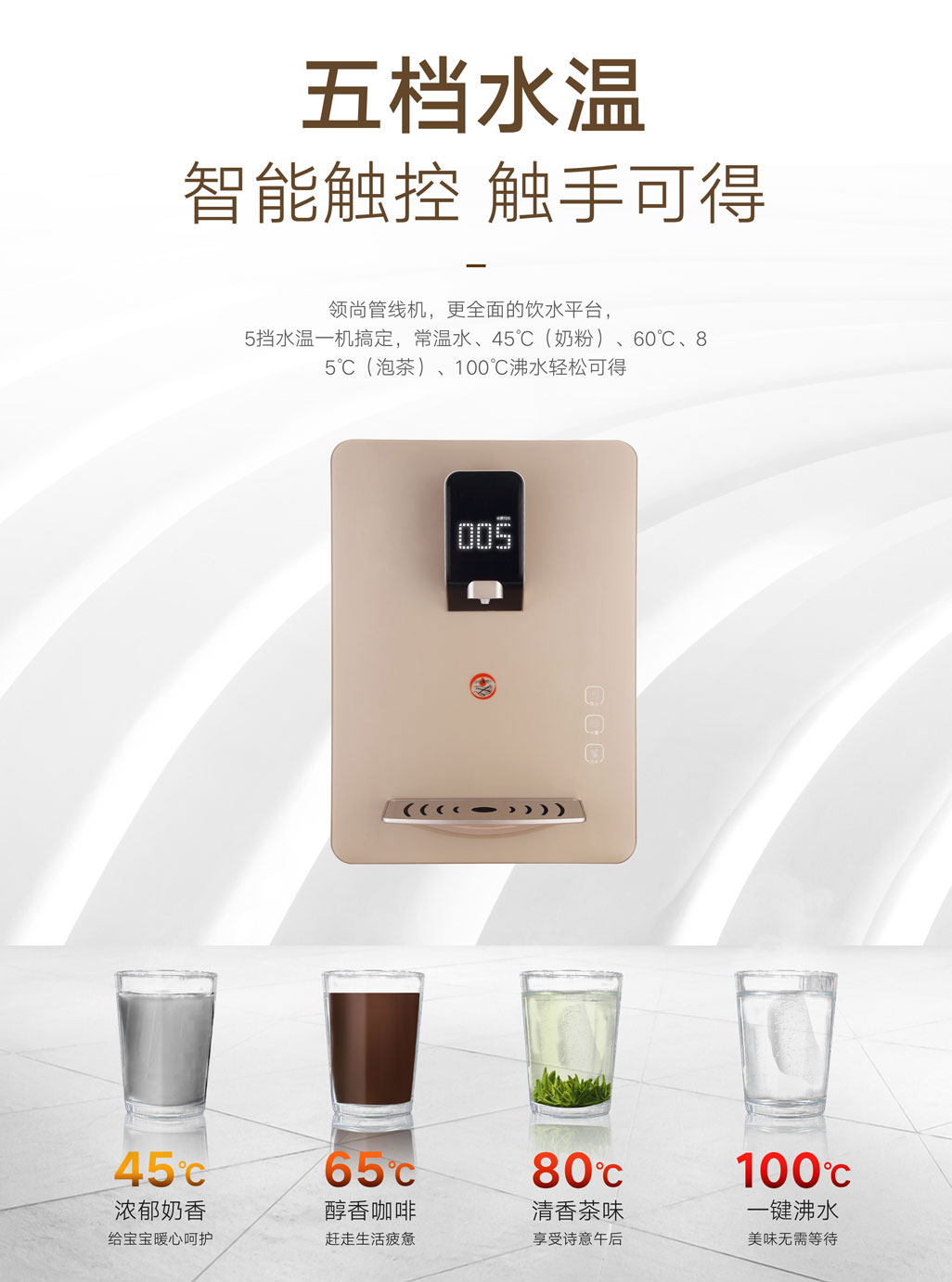 5擋水溫一機搞定,常溫水、45℃(奶粉)、60℃、85℃(泡茶)、100℃沸水統(tǒng)統(tǒng)都有;
