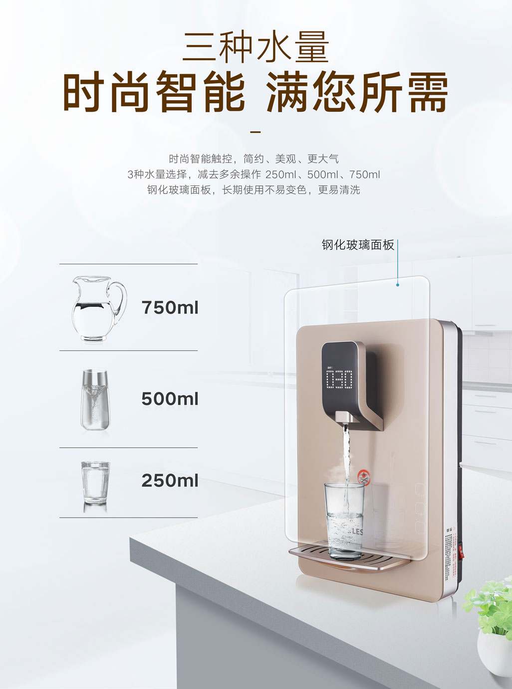 時尚智能觸控,水溫、水量觸手可得,纖薄機身,一機多用,更全面的飲水平臺;
