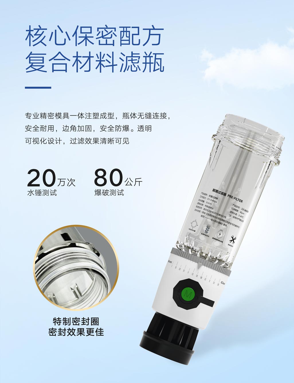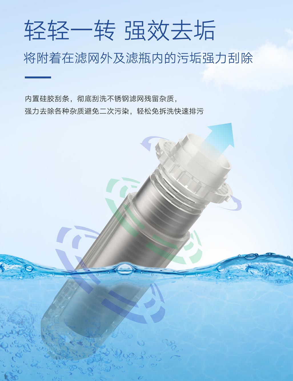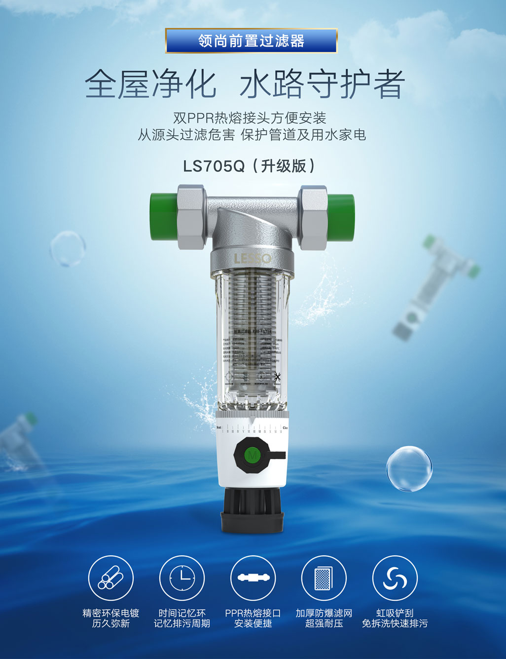 ①40微米高效精濾,食品級(jí)不銹鋼濾網(wǎng),有效阻擋紅蟲、泥沙等雜質(zhì)②虹吸式反沖技術(shù),清洗濾芯污垢,無需更換濾芯③手動(dòng)時(shí)間記憶轉(zhuǎn)盤,記憶排污周期④精密環(huán)保電鍍,歷久彌新⑤PPR熱熔接口,安裝便捷