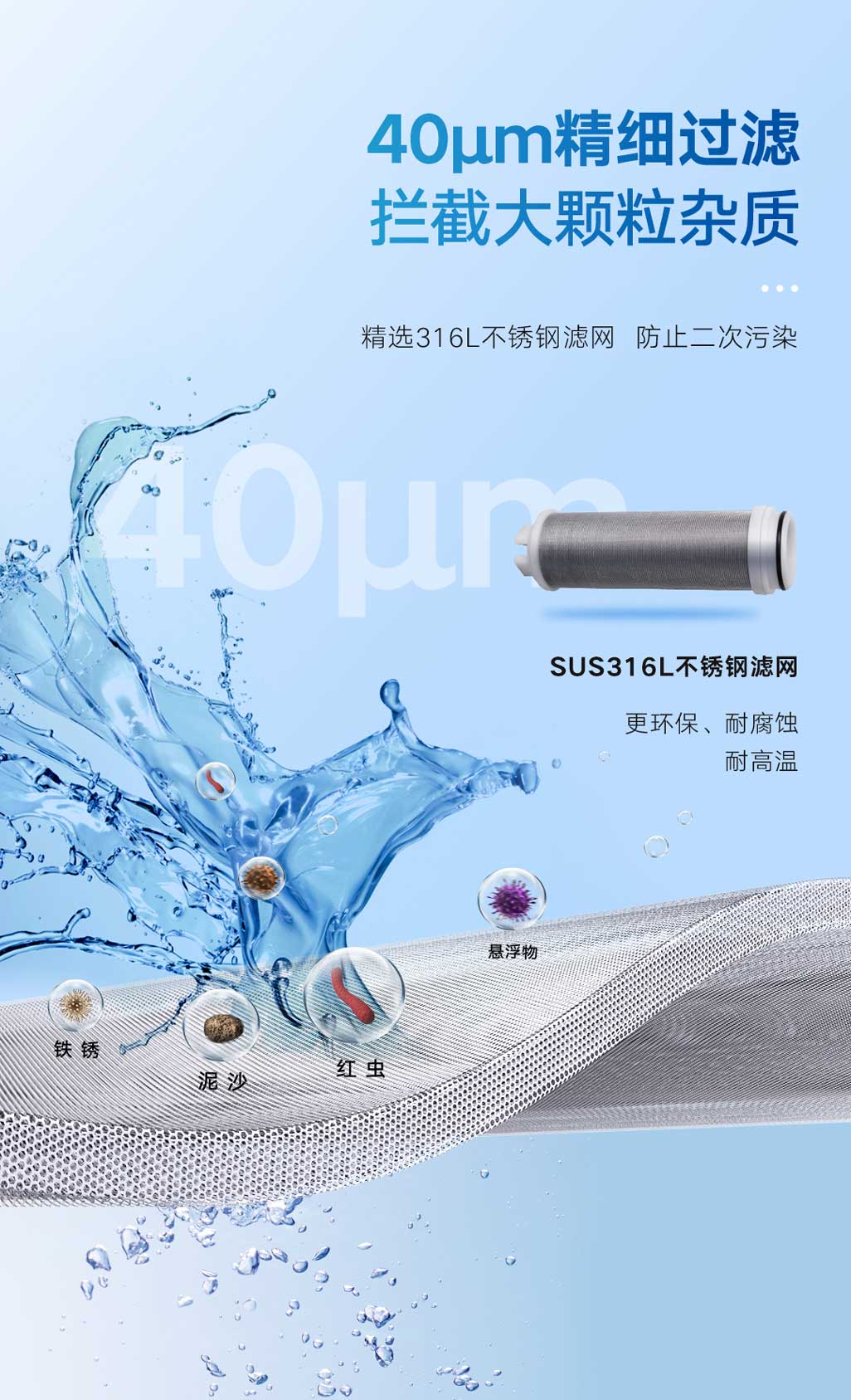 ①40微米高效精濾,食品級(jí)不銹鋼濾網(wǎng),有效阻擋紅蟲、泥沙等雜質(zhì)