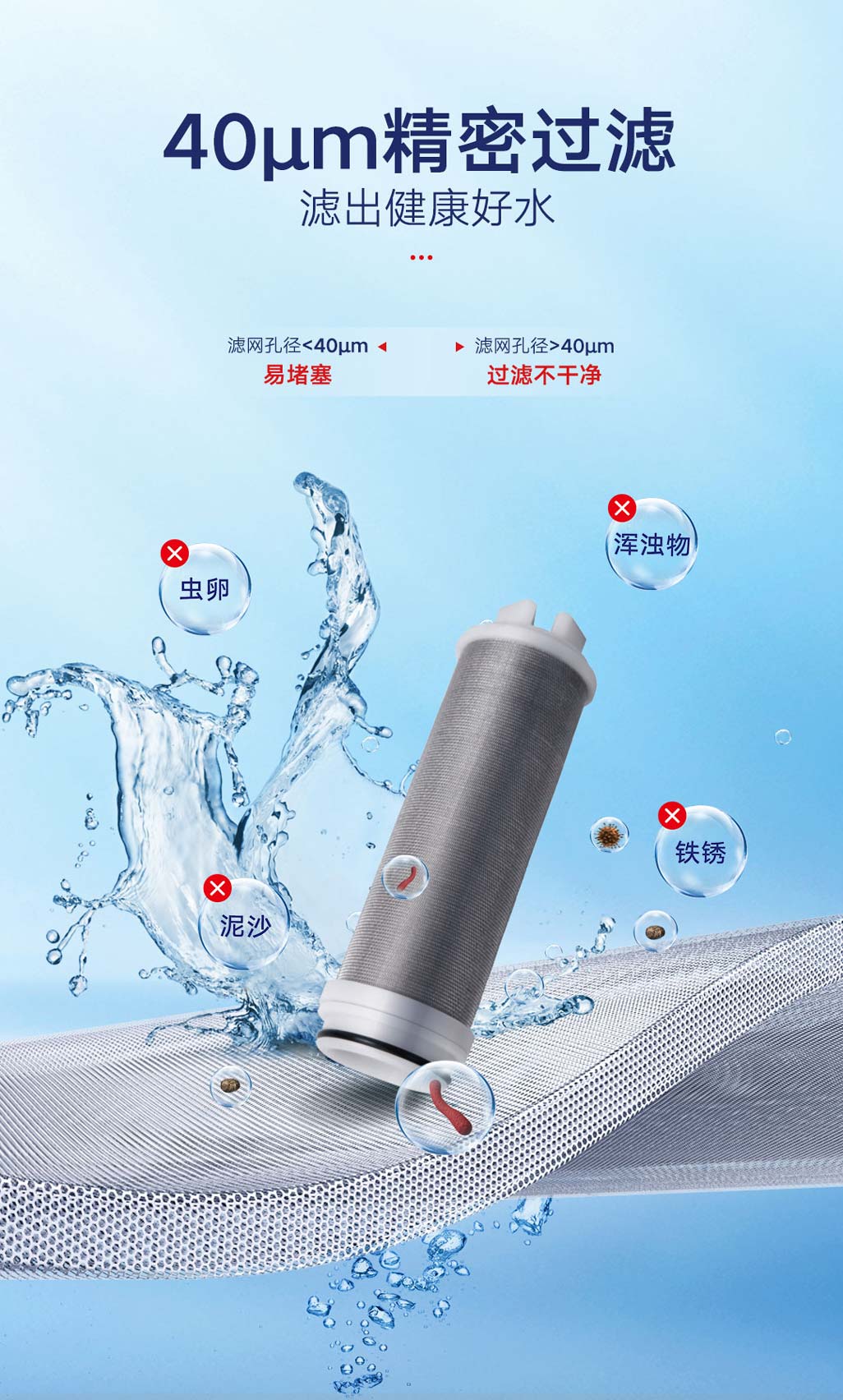 ②40微米高效精濾,食品級(jí)不銹鋼濾網(wǎng),有效阻擋紅蟲、泥沙等雜質(zhì)